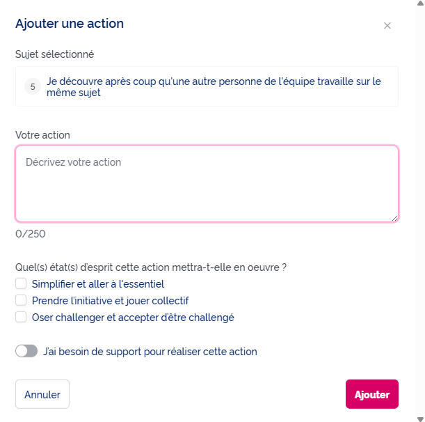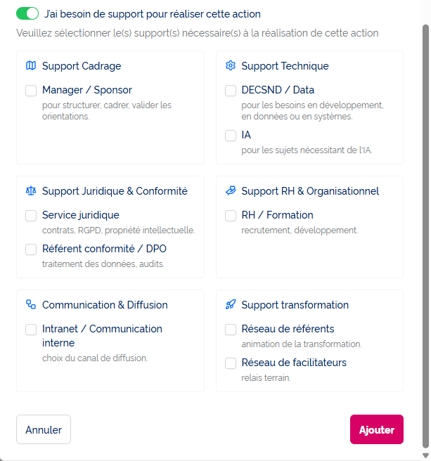 Besoin de support ? Sélectionnez cette option pour indiquer les ressources internes que vous avez besoin de mobiliser pour vous accompagner dans la mise en oeuvre de cette action.