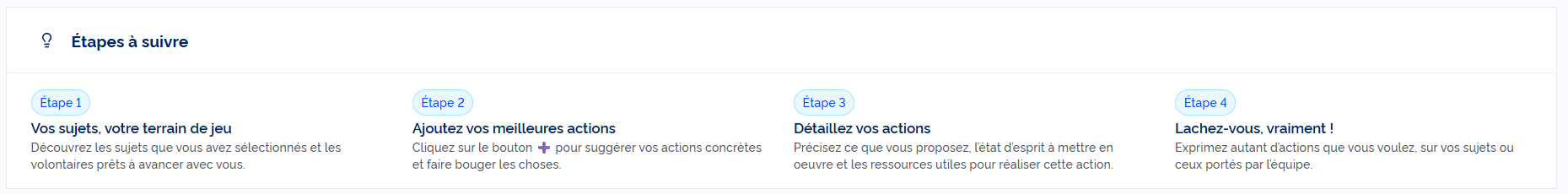 - Mes sujets, mon terrain de jeu : découvrir les sujets que j'ai sélectionné et les volontaires prêts à avancer avec moi.