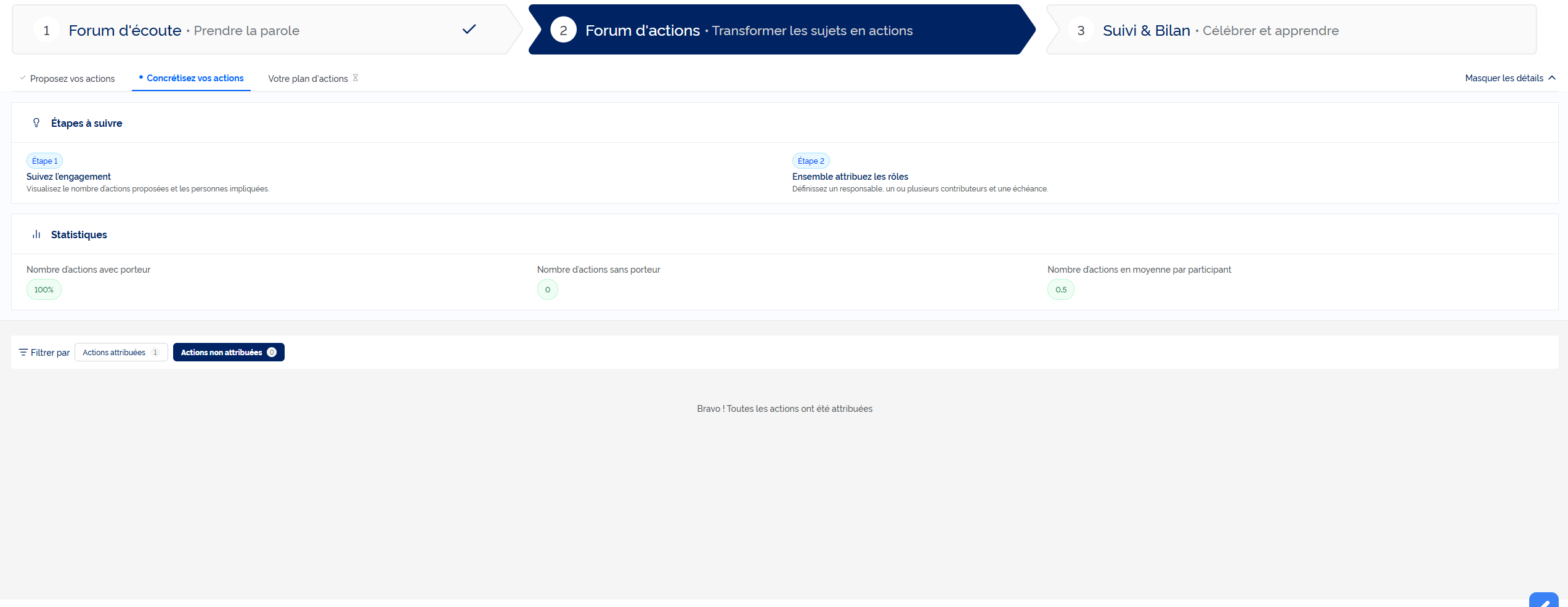 La prochaine étape est clé : le forum d'action permet de visualiser l'ensemble des sujets et d'identifier des porteurs pour garantir l'avancée de tous.